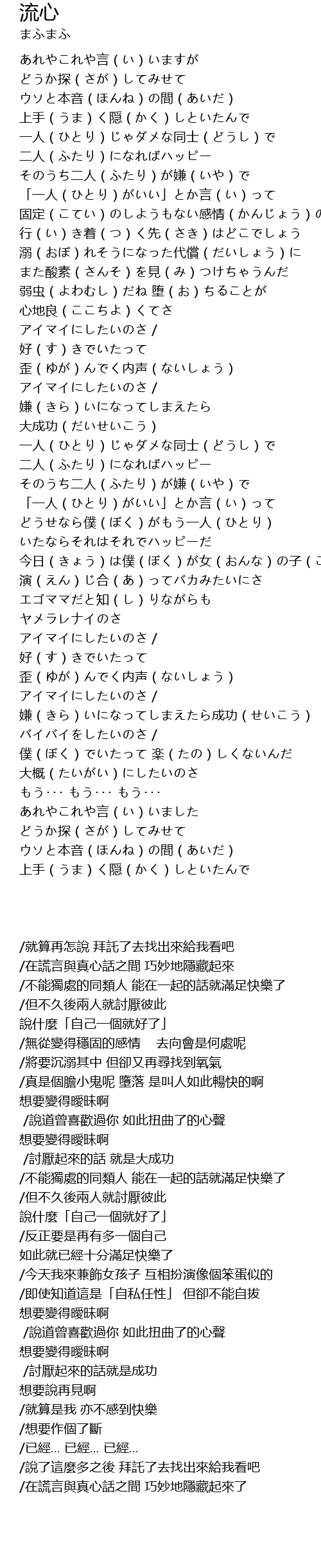 | [00:06.424] | ウソと本音(ほんね)の間(あいだ) 上手(うま)く隠(かく)しといたんで |
