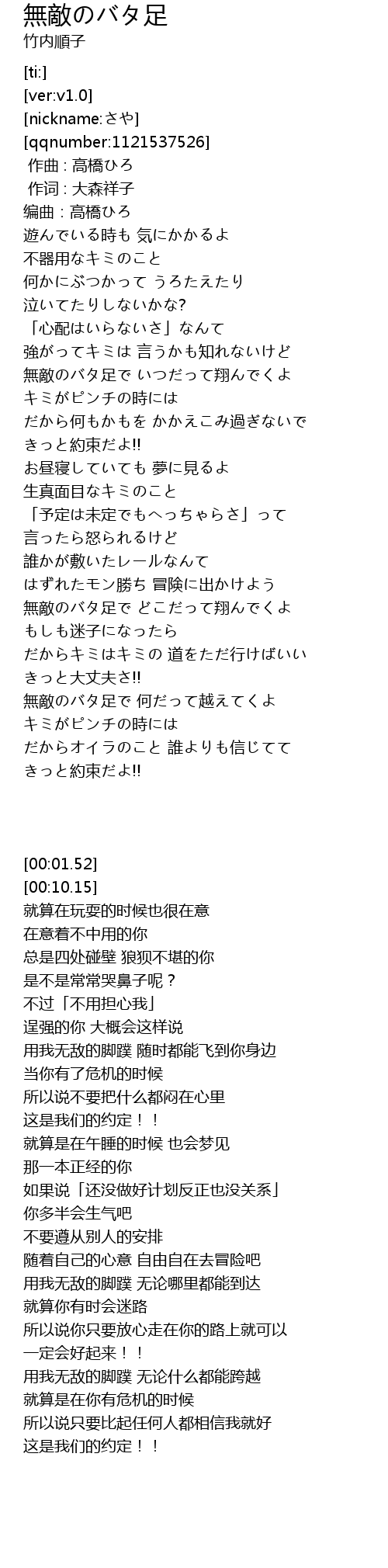 | [02:52.54] | 無敵のバタ足で 何だって越えてくよ |