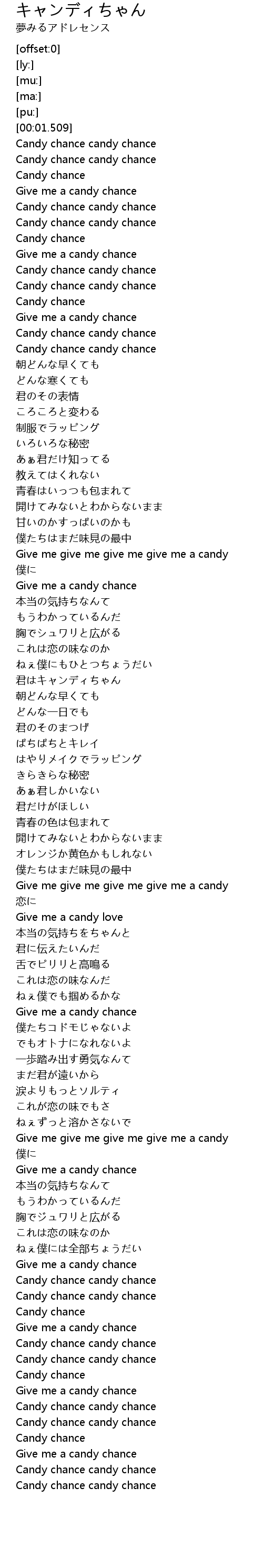 | [00:17.018] | Give me a candy chance |