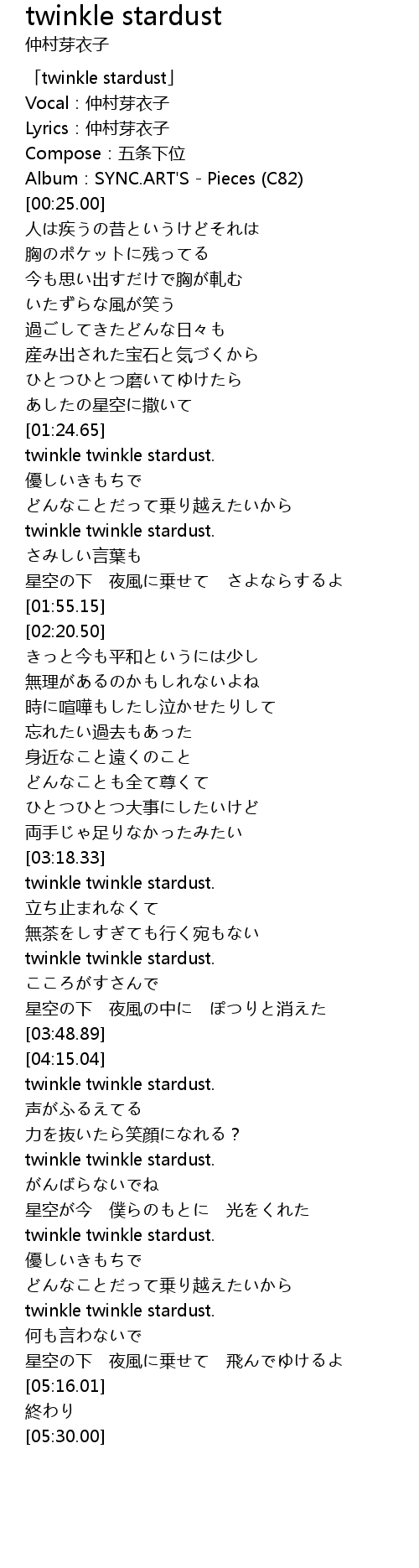 | [03:39.95] | 星空の下 夜風の中に ぽつりと消えた |