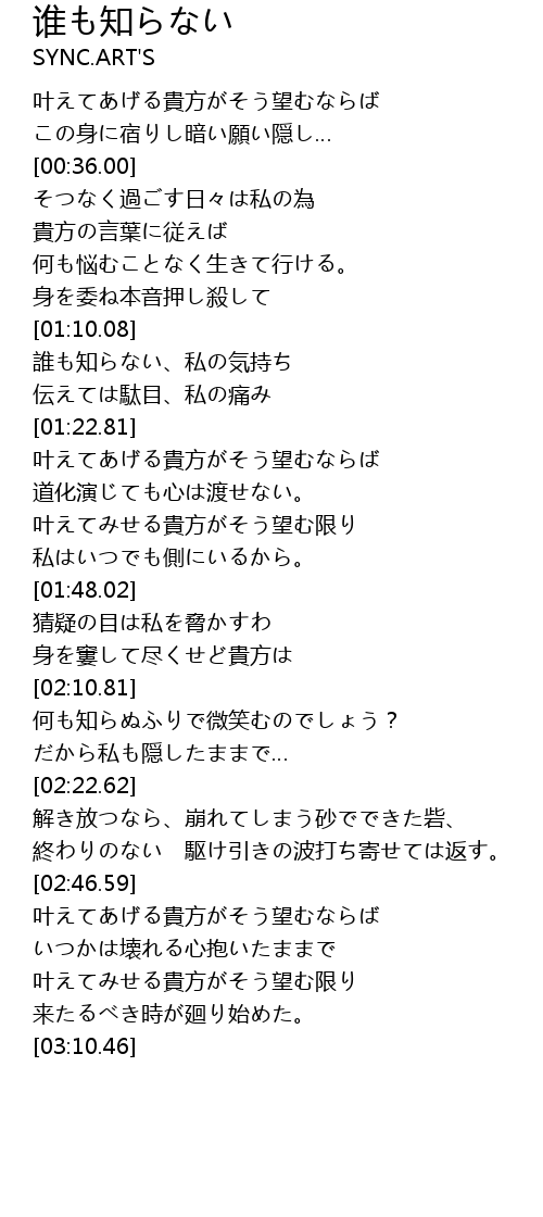 | [01:11.26] | 誰も知らない、私の気持ち |