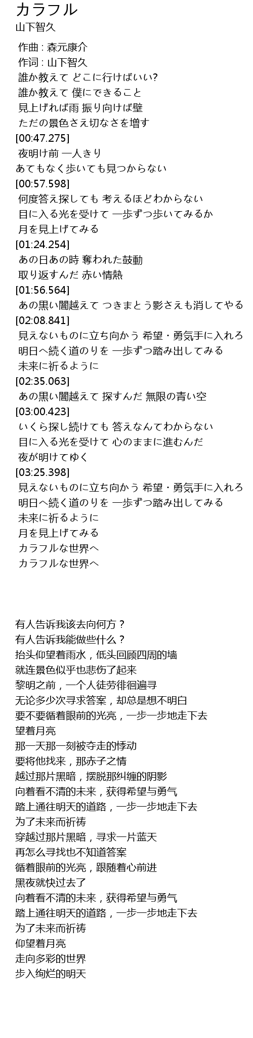 | [00:47.670] | 夜明け前 一人きり あてもなく歩いても見つからない |
