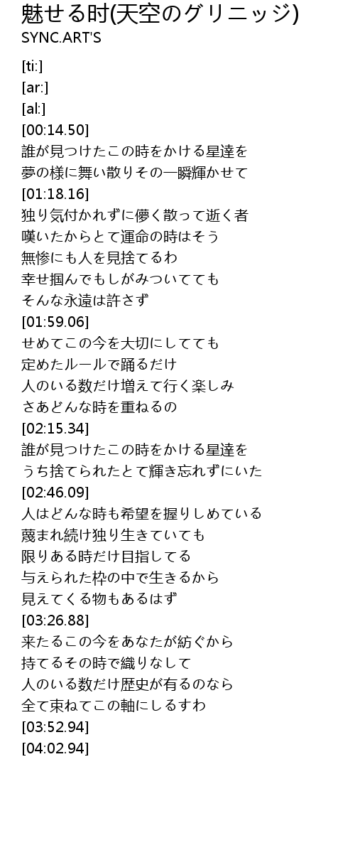 | [01:03.16] | 誰が見つけたこの時をかける星達を |