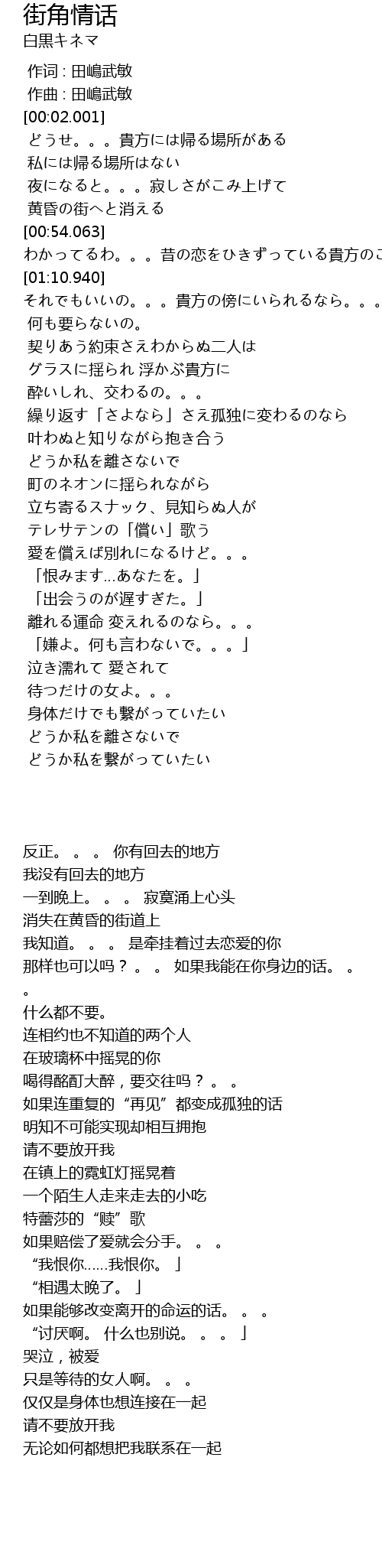 | [00:54.063] | わかってるわ。。。昔の恋をひきずっている貴方のこと |