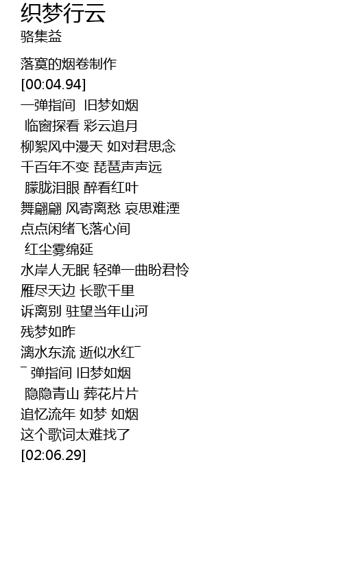 | [00:02.23] | luò mò de yān juàn zhì zuò |