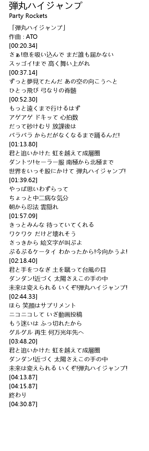 | [01:29.65] | 世界をいっそ股にかけて 弾丸ハイジャンプ! |