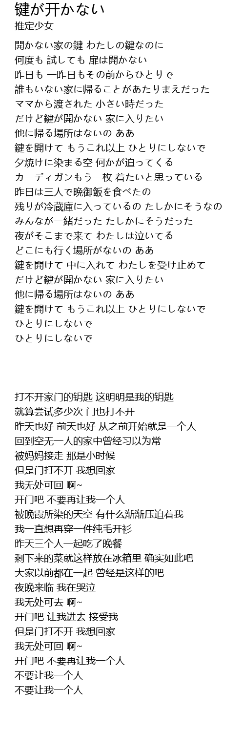 | [00:13.14] | 開かない家の鍵 わたしの鍵なのに |