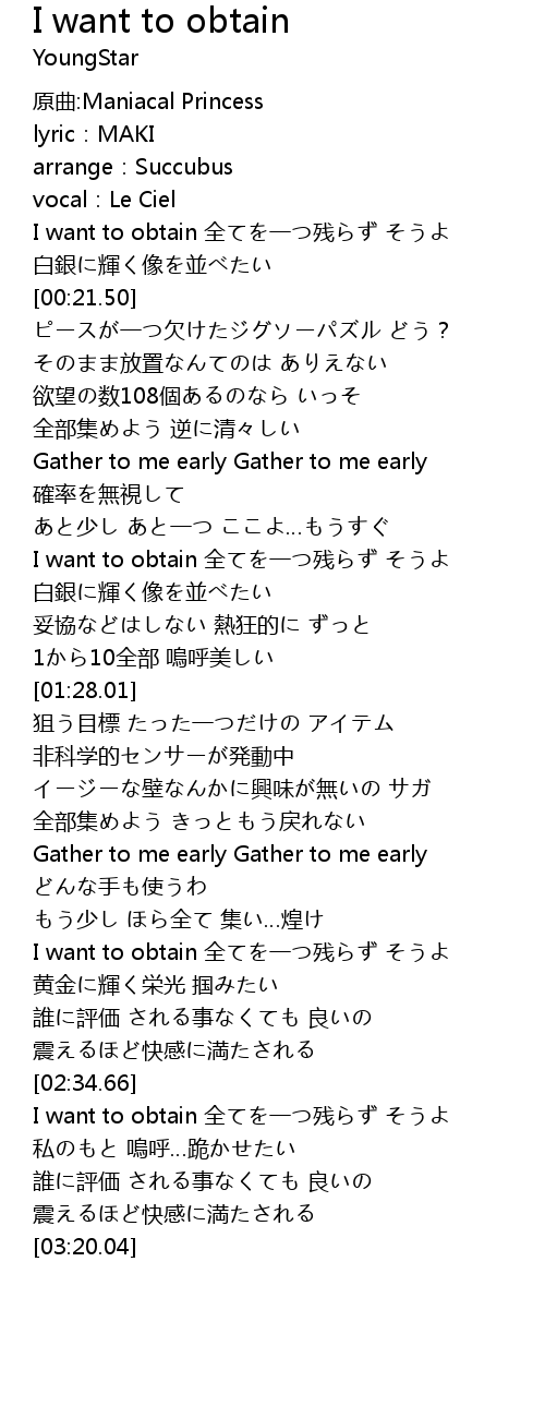 | [01:06.55] | I want to obtain 全てを一つ残らず そうよ |