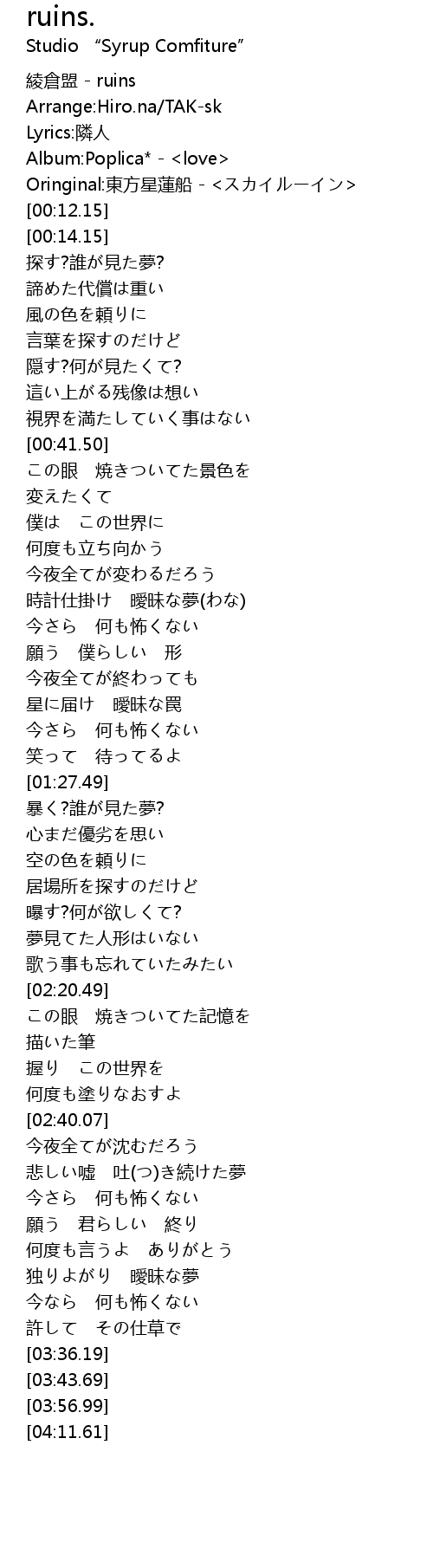 | [00:00.00] | 綾倉盟 - ruins |