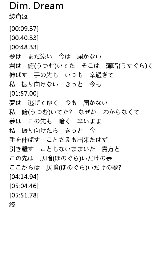 | [04:00.69] | ここからは 仄暗(ほのぐら)いだけの夢? |