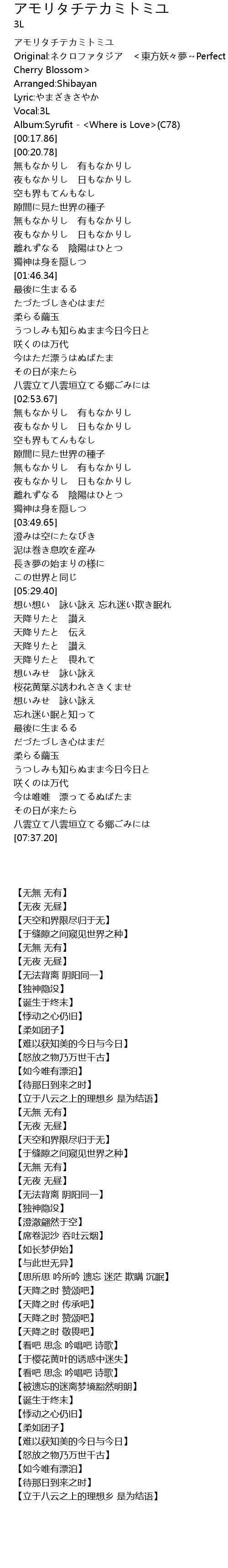 | [00:03.52] | Original:ネクロファタジア <東方妖々夢~Perfect Cherry Blossom> |