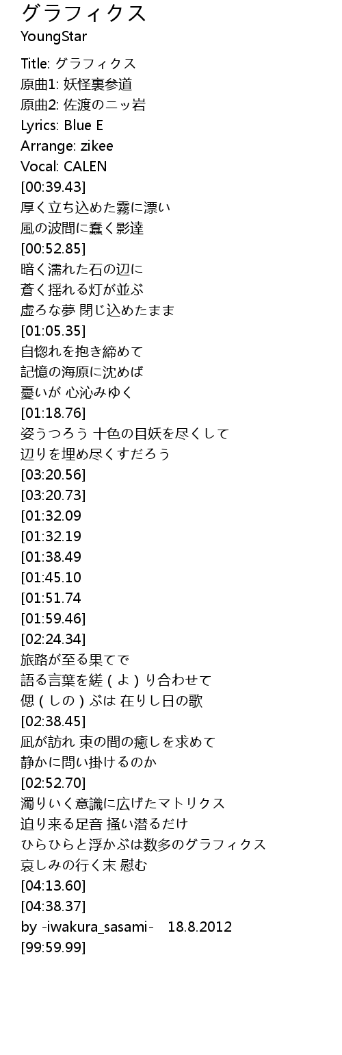 | [03:59.10][01:45.10] | ゆらゆらと踊るは数多のグラフィクス |