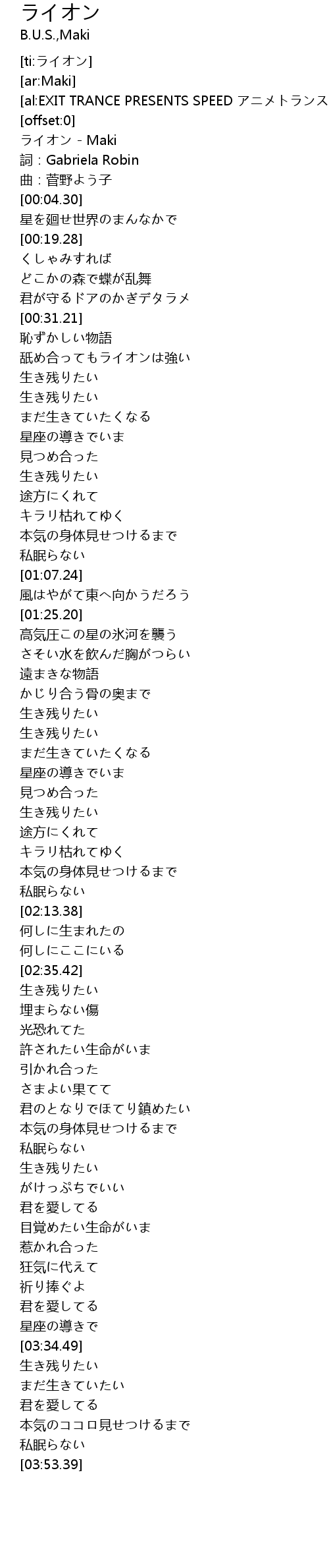 | [00:34.35] | 舐め合ってもライオンは強い |