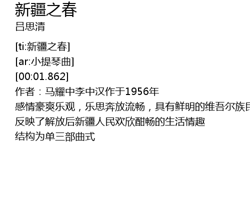 | [00:44.803] | 感情豪爽乐观,乐思奔放流畅,具有鲜明的维吾尔族民族音乐风格 |