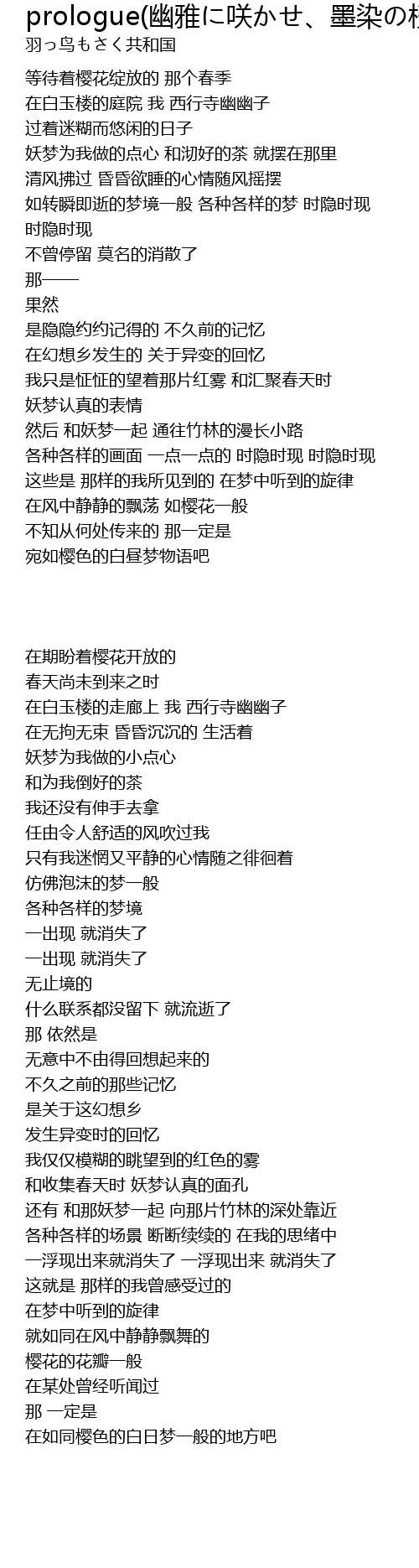 | [00:15.000] | 在白玉楼的庭院 我 西行寺幽幽子 过着迷糊而悠闲的日子 |