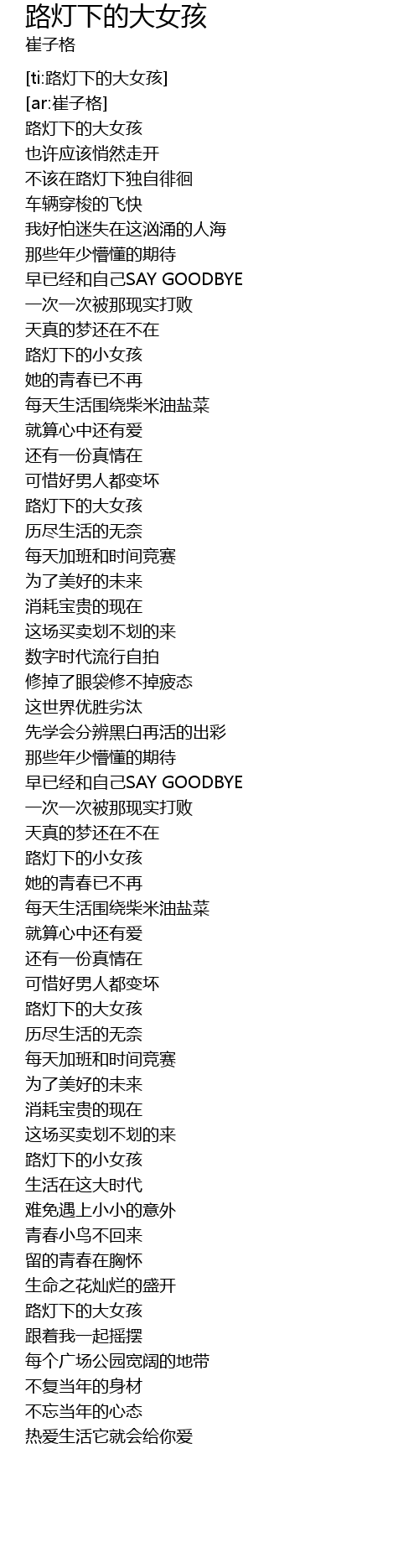 | [02:35.541] | lù dēng xià de dà nǚ hái |