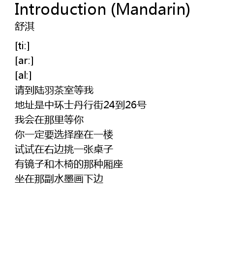 | [00:16.40] | 请到陆羽茶室等我 |
