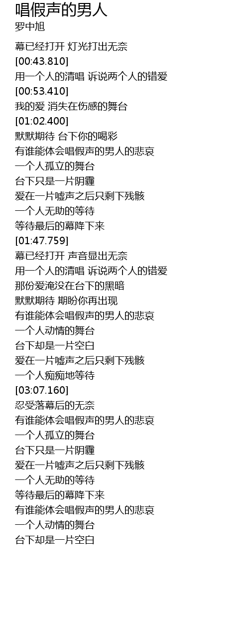 | [03:47.370] | 有谁能体会唱假声的男人的悲哀 |