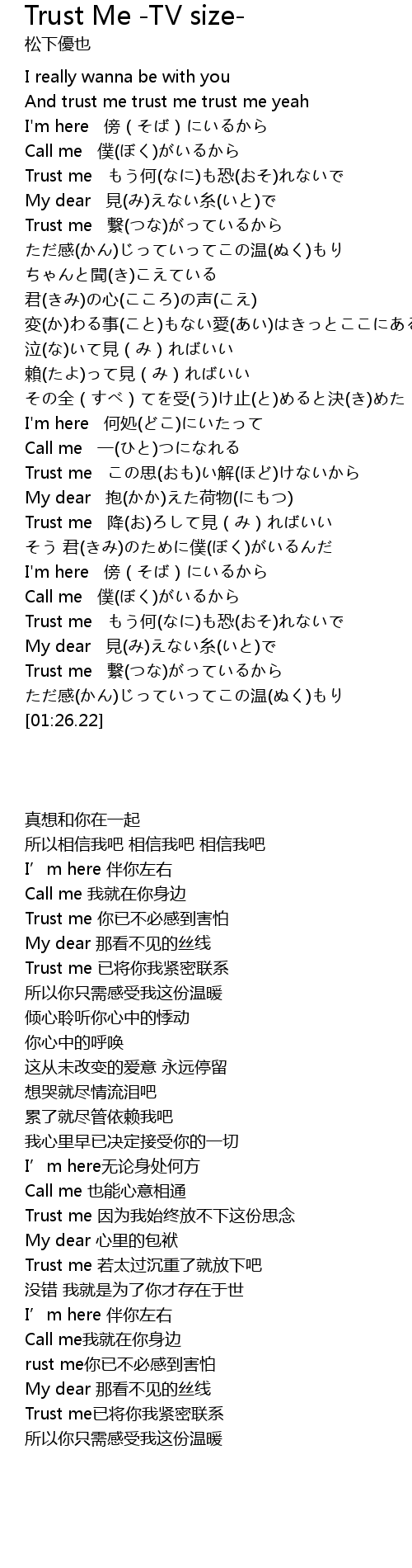 | [01:19.36] | Trust me 繋(つな)がっているから |