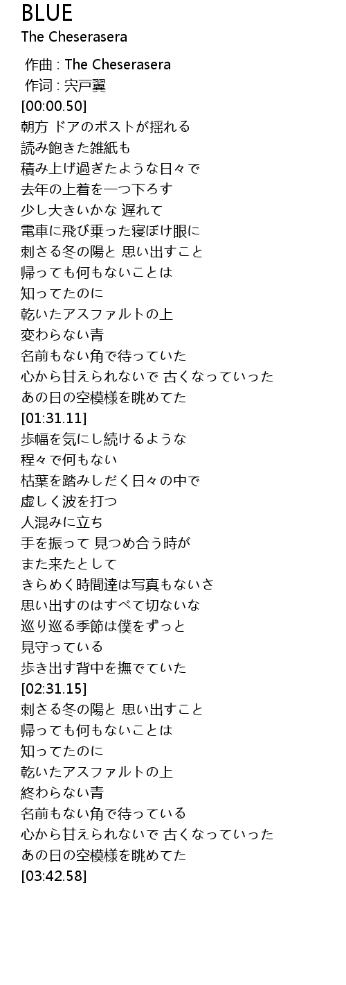 | [02:57.71] | 刺さる冬の陽と 思い出すこと |