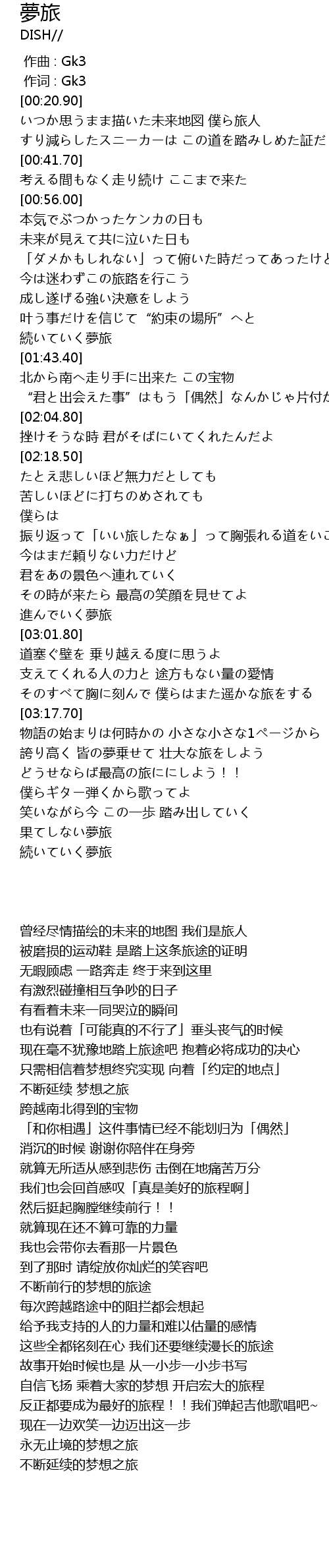 | [00:20.94] | いつか思うまま描いた未来地図 僕ら旅人 |