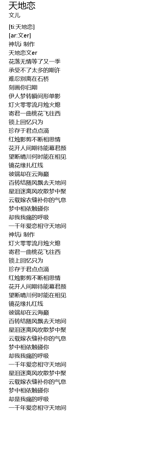 | [04:01.288] | yī qiān nián ài liàn xiāng shǒu tiān dì jiān |