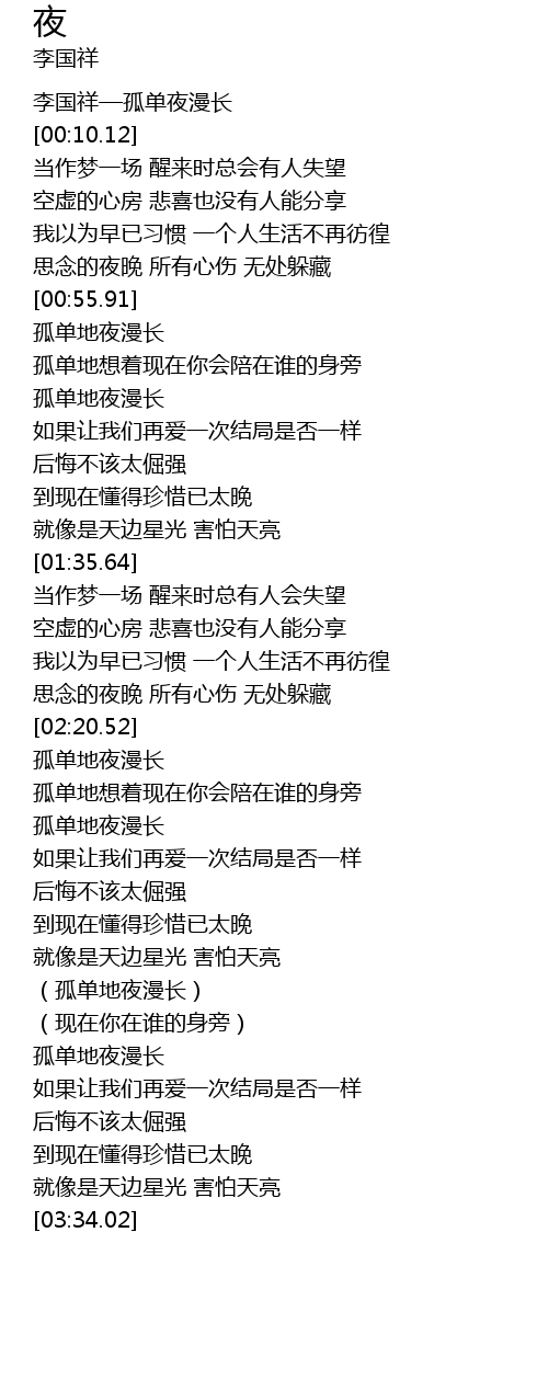 | [00:00.00] | 李国祥—孤单夜漫长 |