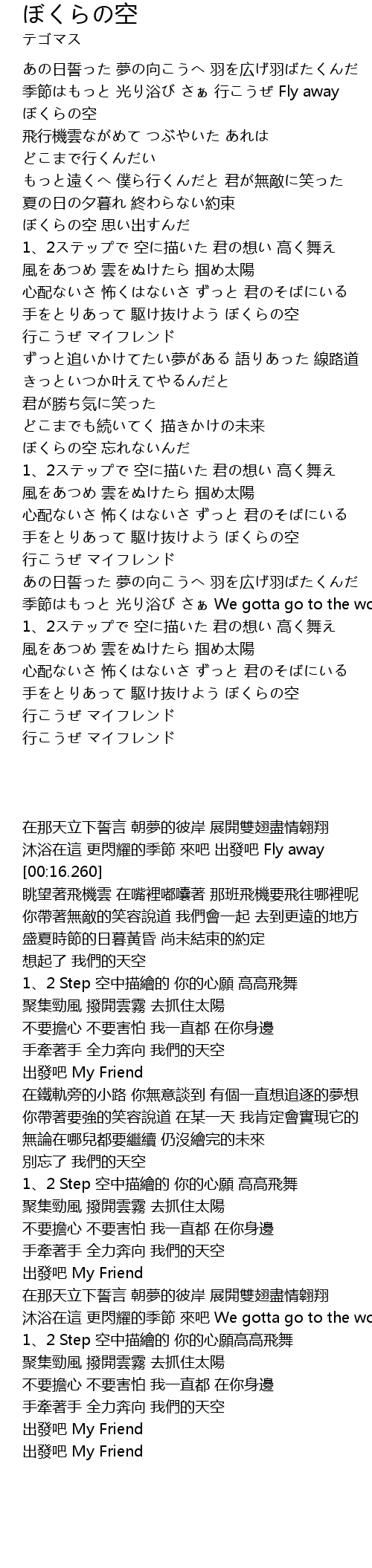 | [01:16.540] | 手をとりあって 駆け抜けよう ぼくらの空 |