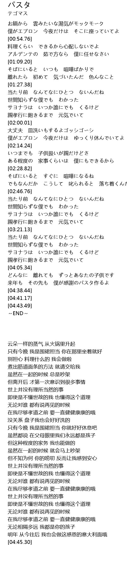 | [04:21.08] | 来年も その先も 僕が感謝のパスタ作るよ |