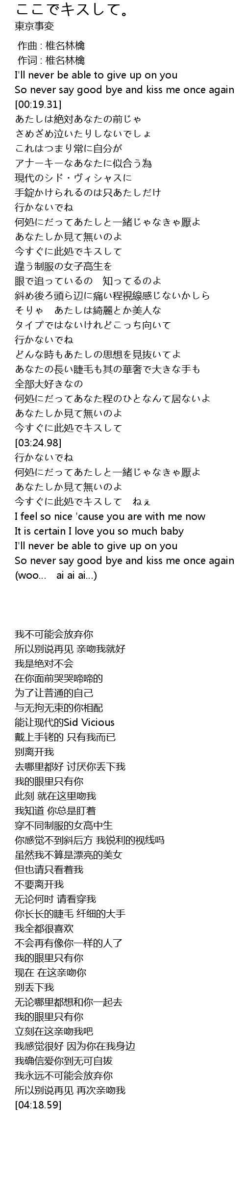 | [03:44.04] | 今すぐに此処でキスして ねぇ |