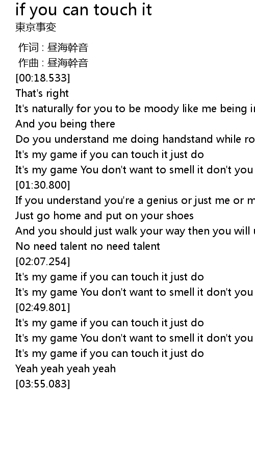| [02:36.688] | It' s my game You don' t want to smell it don' t you |