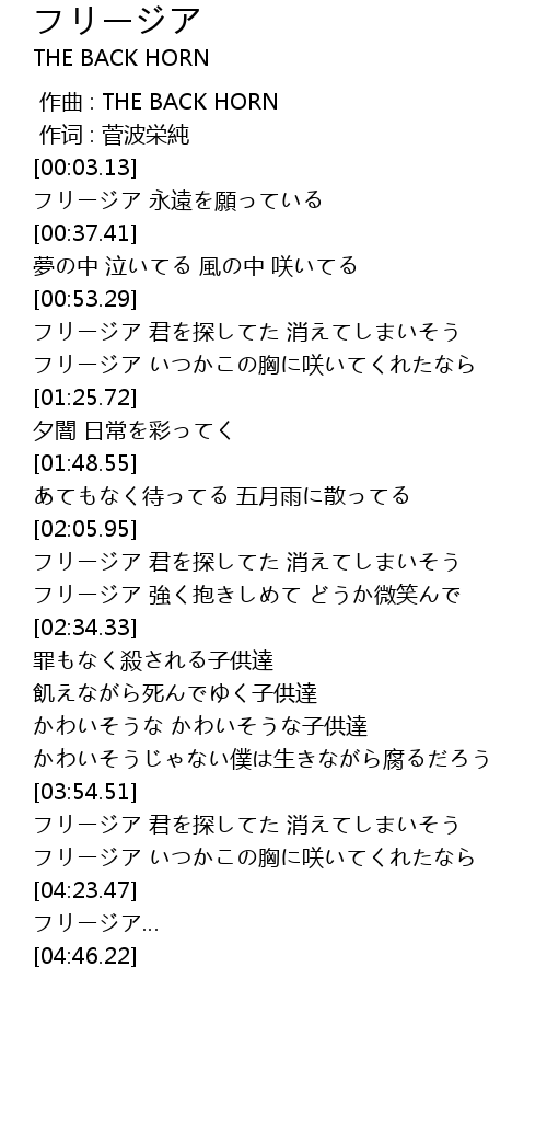 | [02:21.6] | フリージア 強く抱きしめて どうか微笑んで |