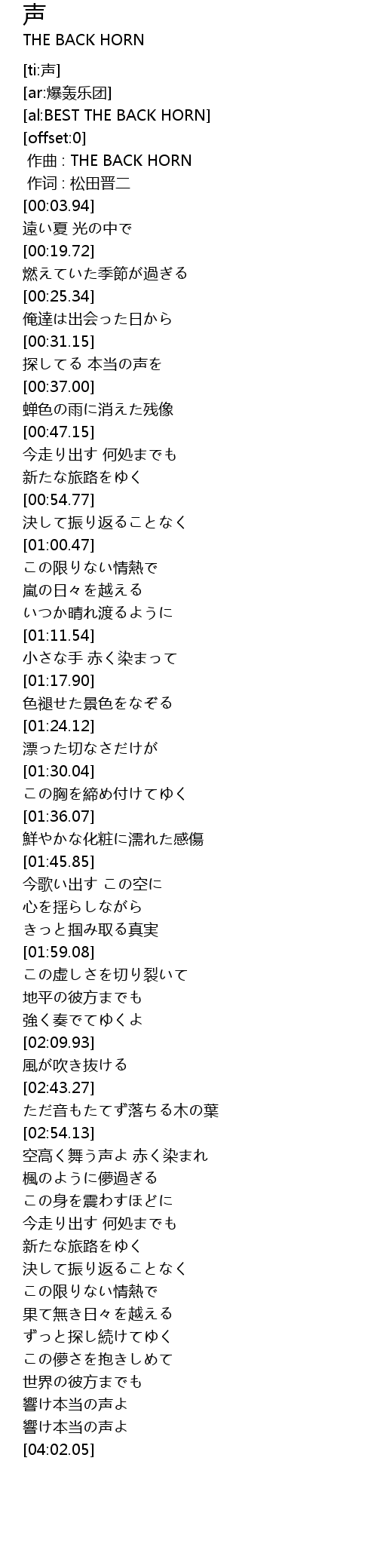 | [00:00.00] | zuò qǔ : THE BACK HORN |