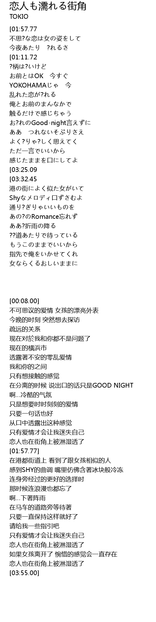| [00:08.00][01:57.77][03:55.00] | TOKIO liàn rén rú jiē jiǎo |