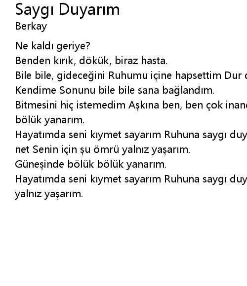| Hayat mda seni k ymet sayar m Ruhuna sayg duyar m Senin i in u mrü yaln z ya ar m. |