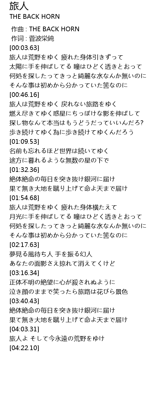 | [00:46.53] | 旅人は荒野をゆく 戻れない旅路をゆく |