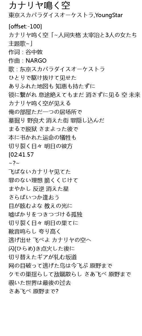 | [00:00.50] | カナリヤ鸣く空「~人间失格 太宰治と3人の女たち 主题歌~」 |