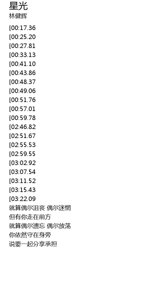 | [03:42.85][02:46.82][01:07.19] | 一起拥抱满天的星光 |