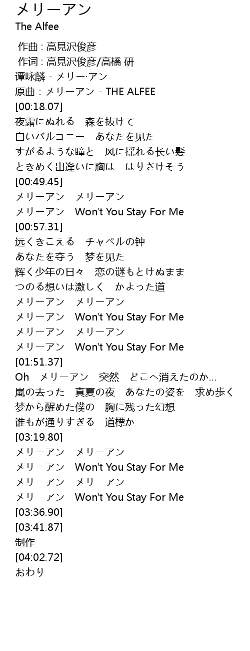 | [03:31.40] | メリーアン Won't You Stay For Me |