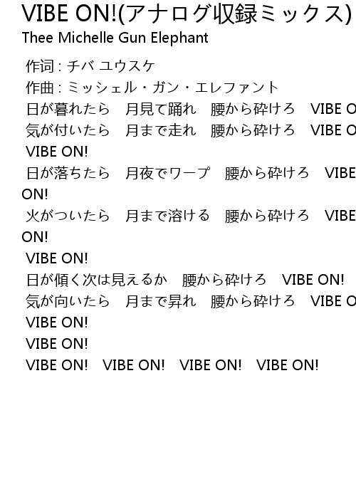 | [00:56.498] | 火がついたら 月まで溶ける 腰から砕けろ VIBE ON! |