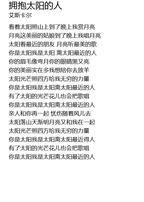 | [01:53.860] | nǐ shì tài yáng wǒ shì tài yáng lí tài yáng zuì jìn de rén |