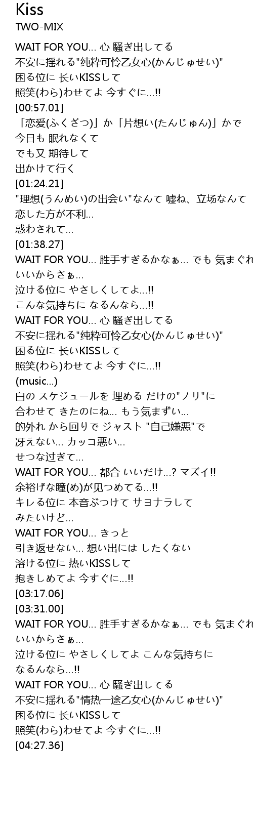 | [01:39.19] | WAIT FOR YOU… 胜手すぎるかなぁ… でも 気まぐれでも いいからさぁ… |