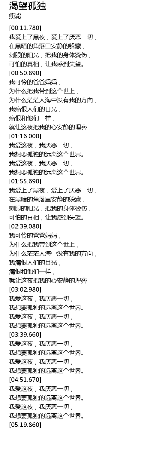 | [04:57.770] | 我想要孤独的远离这个世界。 |