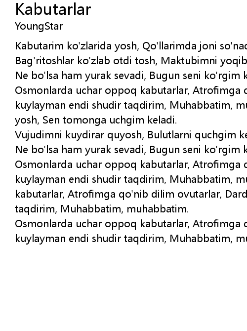 Osmonlarda uchar oppoq kabutarlar, Atrofimga qo'nib meni ovutarlar, Dardim kuylayman endi shudir taqdirim, Muhabbatim, muhabbatim. Osmonlarda uchar oppoq kabutarlar, Atrofimga qo'nib dilim ovutarlar, Dardim kuylayman endi shudir taqdirim, Muhabbatim, muhabbatim. |