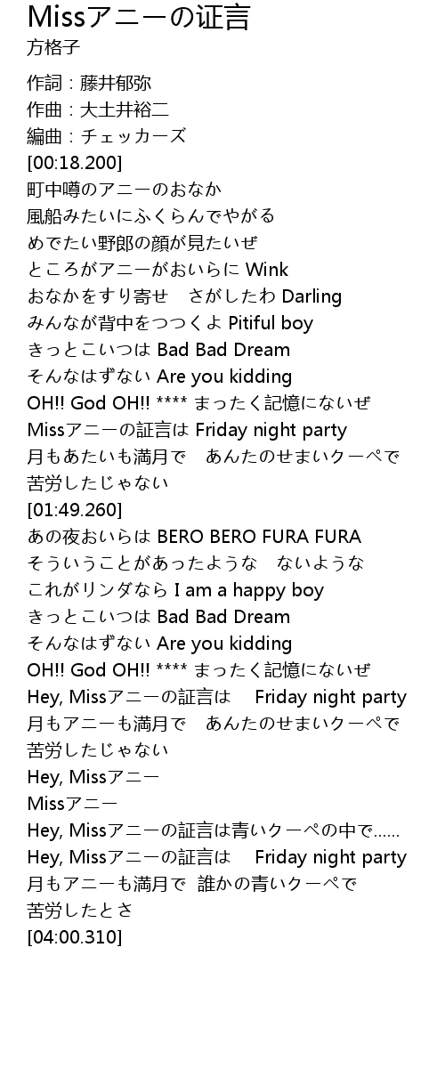 | [03:38.300] | Hey, Missアニーの証言は Friday night party |