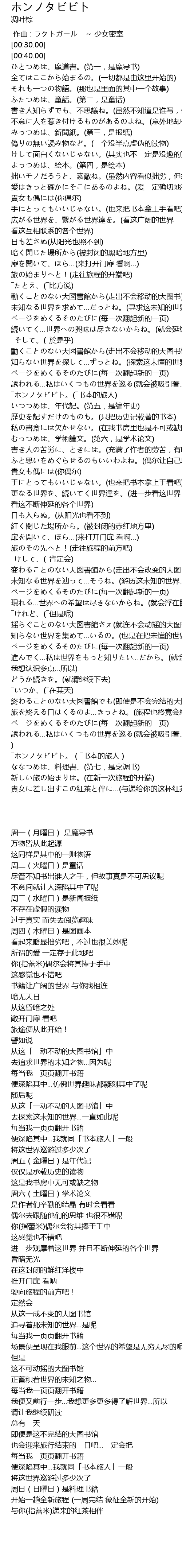 | [03:23.00] | ―ホンノタビビト。(―书本的旅人) |
