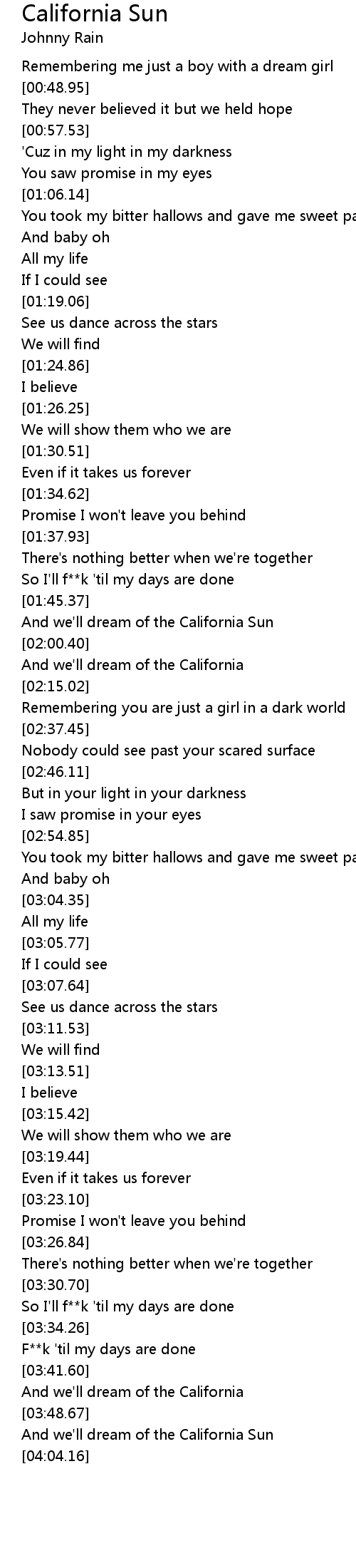 And we'll dream of the California Sun |