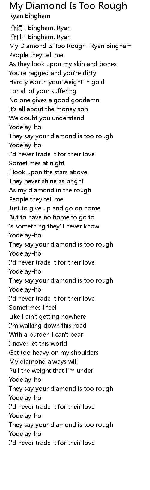 | [00:00.361] | My Diamond Is Too Rough Ryan Bingham |