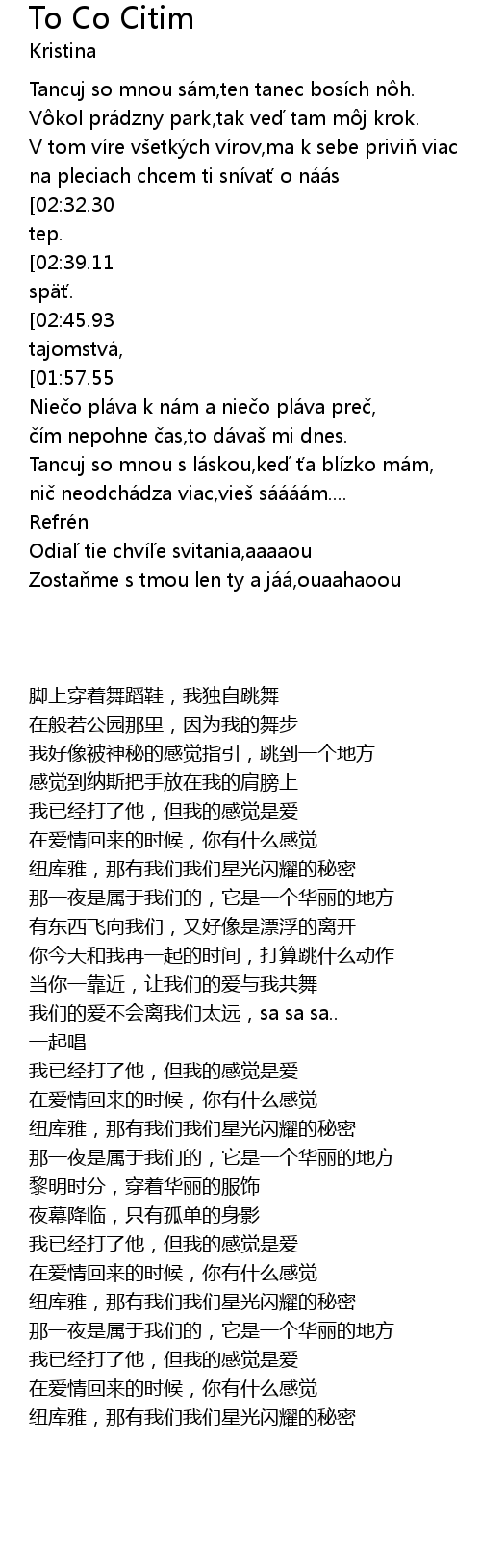 | [03:00.42][02:32.30][01:36.63][00:40.88] | To o ci tim je la ska, ja ma m u jej tep. |