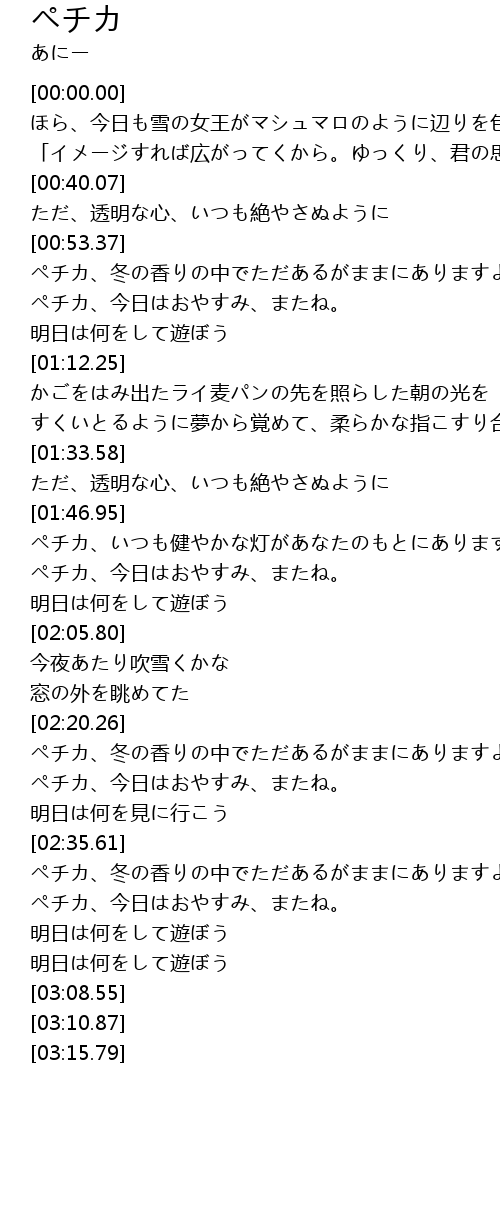 | [01:03.14] | ペチカ、今日はおやすみ、またね。 |
